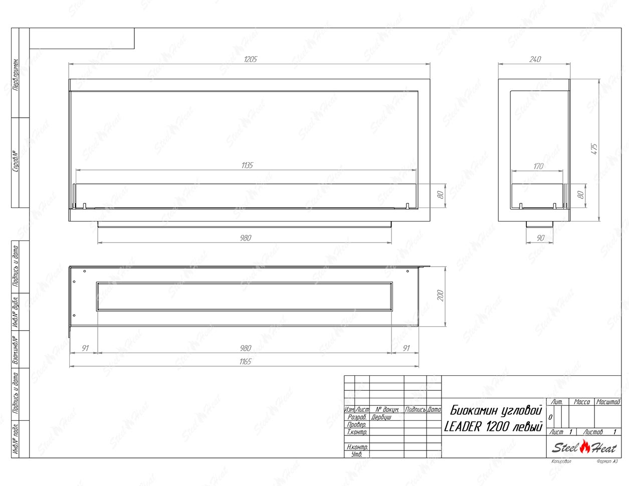 Встраиваемый Биокамин угловой SteelHeat Leader 1200 левый предназначен для встраивания в глухие ниши из гипсокартона, кирпича, пеноблоков, бетона.