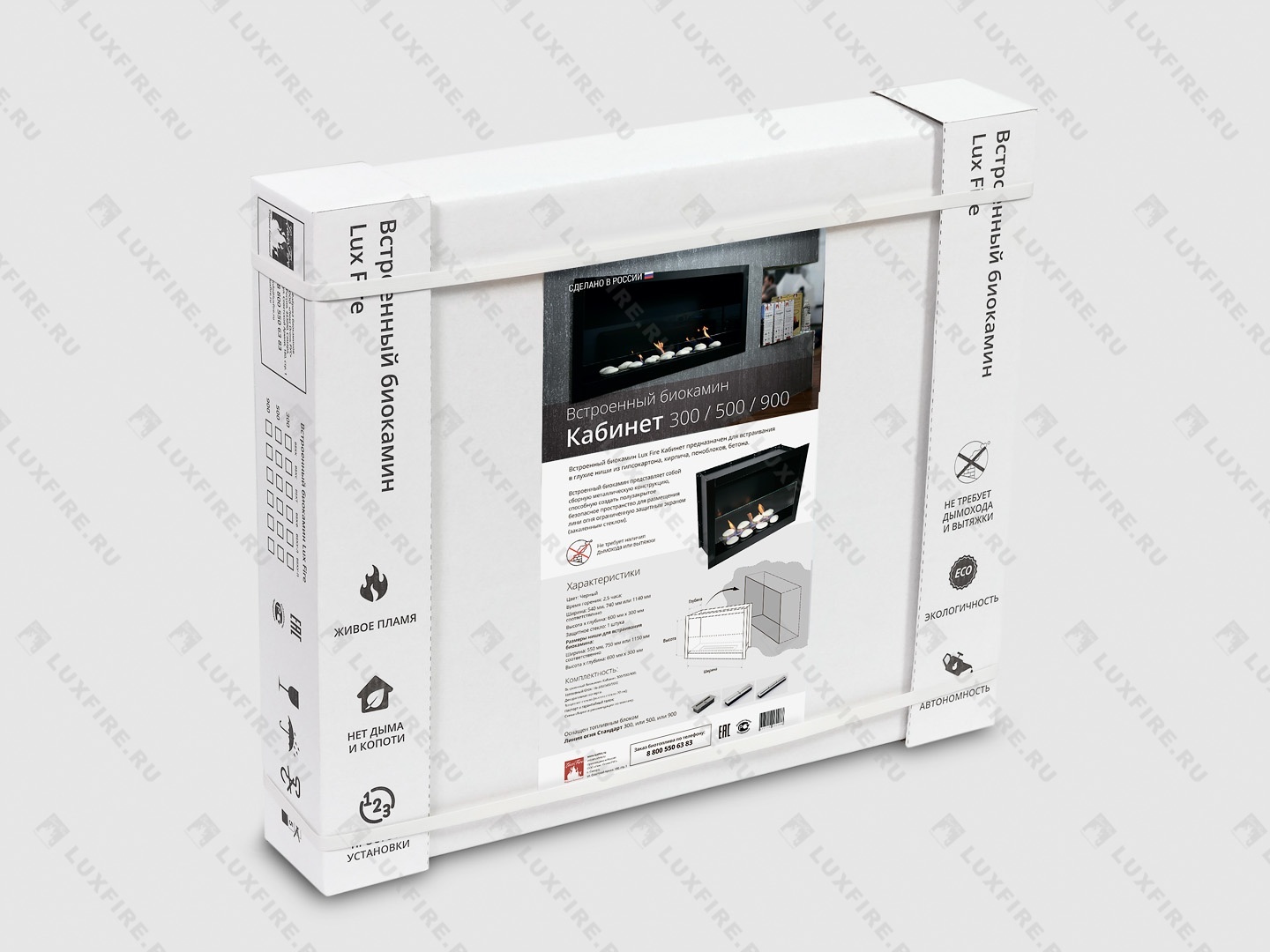 Представляет собой сборный металлический каркас с топливным блоком Lux Fire 500 М, закрепленный на 4 дистанционных держателях к защитному стеклу с подвесом к стене.